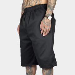 Bermuda preta de sarja, feita com material durável e resistente, a modelagem dela é reta, tem bolsos grandes na frente, verso e bolso lateral, sua cintura elástica vem com cordão para ajuste, a cor preta é neutra podendo ser usada com nossas camisetas pra qualquer role!
